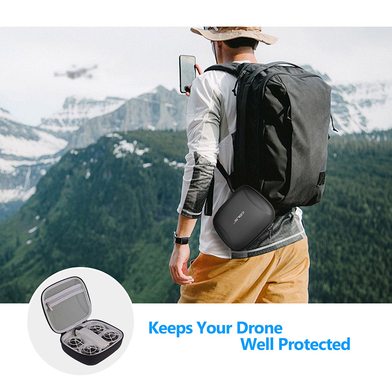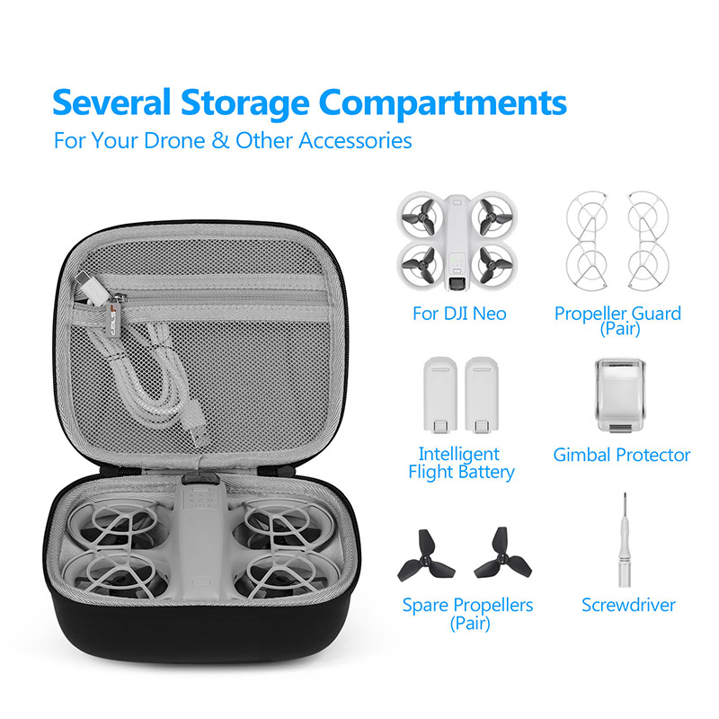 Features: Specially designed for DJI Neo. The foam inside is cut out perfectly to fit DJI Neo and its accessories. Accommodates all the basic drone stuff including DJI Neo, propeller guard, intelligent flight battery, gimbal protector, spare propellers and screwdriver. The PU leather outer shell and pre-cut padded interior protect your drone and accessories against dents and bumps. Splashproof & shockproof, great for traveling Compact & lightweight, small enough to fit in most bags Helps to keep your drone safe and clean while not in use Makes traveling easier, keeps your drone well protected |