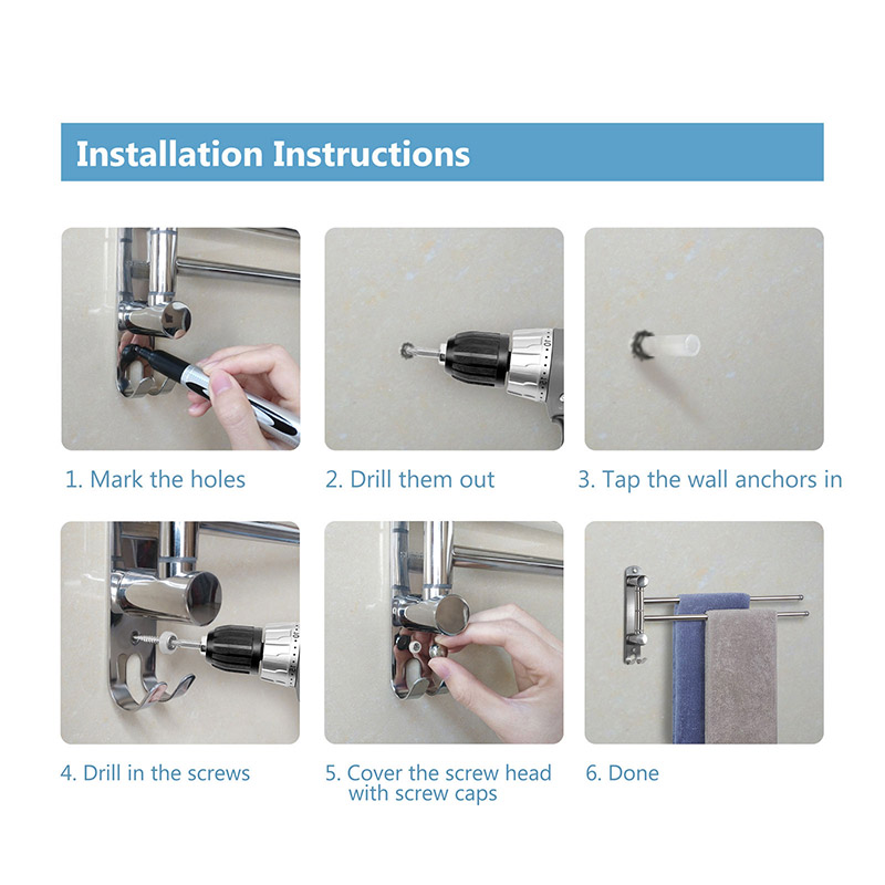 Installation Instructions: 1. Mark the holes 2. Drill them out 3. Tap the wall anchors in 4. Drill in the screws 5. Cover the screw head with screw caps 6. Done