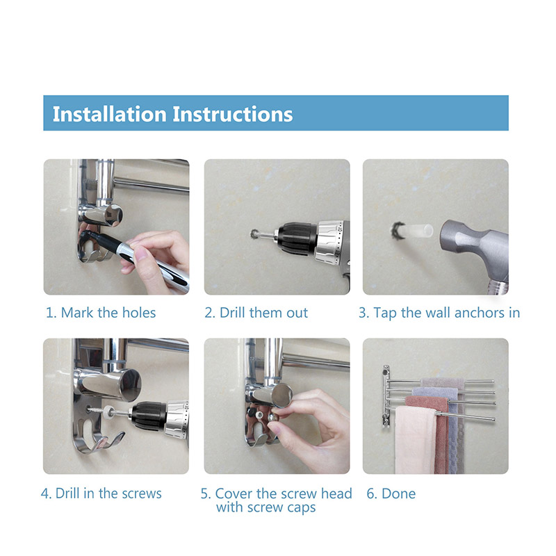 Installation Instructions: 1. Mark the holes 2. Drill them out 3. Tap the wall anchors in 4. Drill in the screws 5. Cover the screw head with screw caps