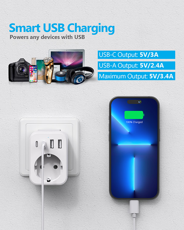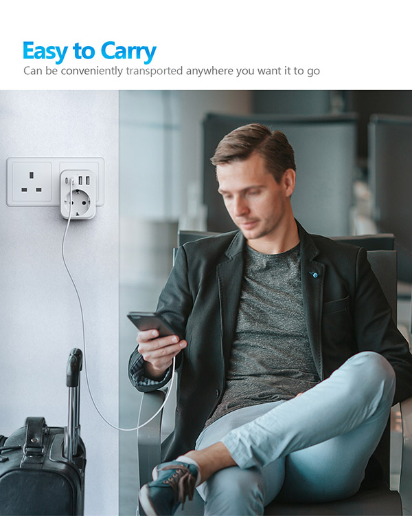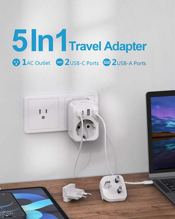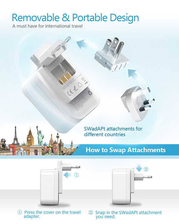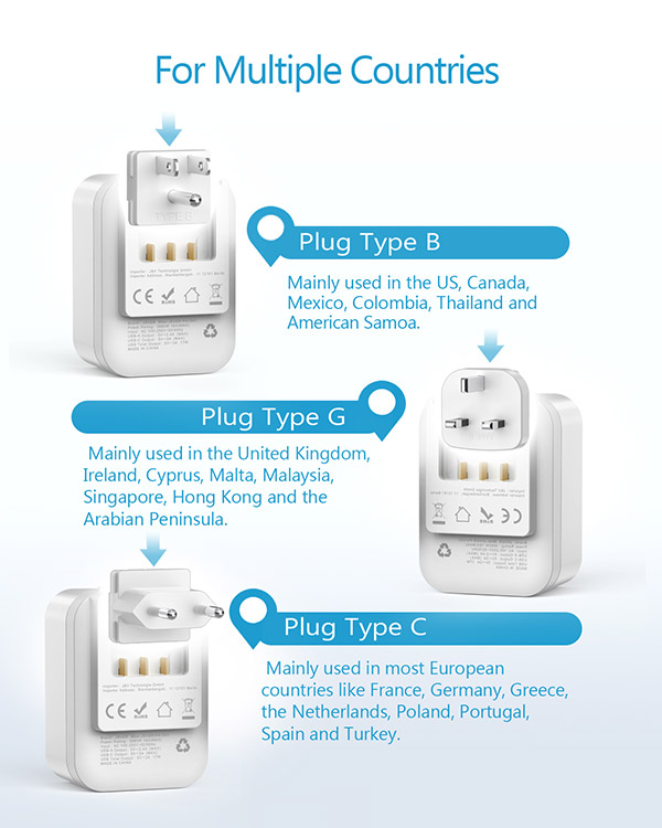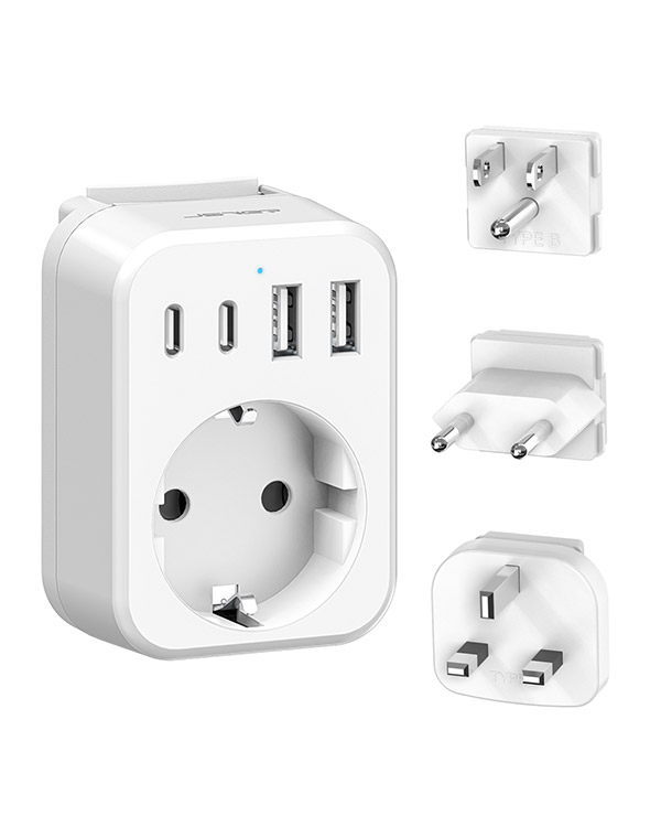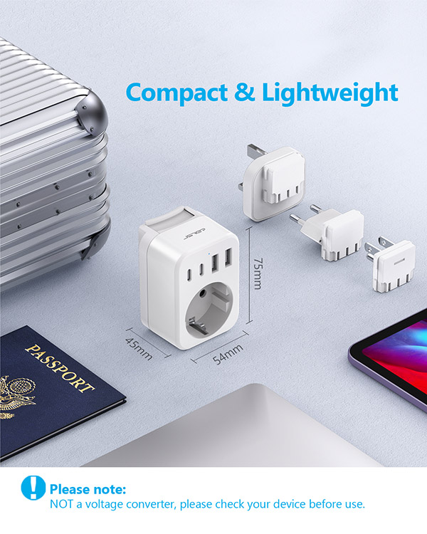 Features: 3 SWadAPt attachments + 2 USB-A ports+ 2 USB-C ports The two USB-C ports can deliver 3.0A/15W of charging power, while the two USB-A ports can deliver up to 2.4A/12W of charging power. The max power output is 3680W. Can be used with mobile phones, cameras, laptops, tablets and high-power appliances such as hair straighteners. Compact and easy to tuck into your carry-on, backpack, or travel bag to use on the road. Space-efficient and ergonomic Please note: This adapter is NOT a voltage converter. Please make sure all your devices are compatible with the standard voltage in the country you are visiting. It works well with any dual voltage device, but it is best to check the actual power requirements for the device that is printed somewhere on the chassis or AC/DC charger. |