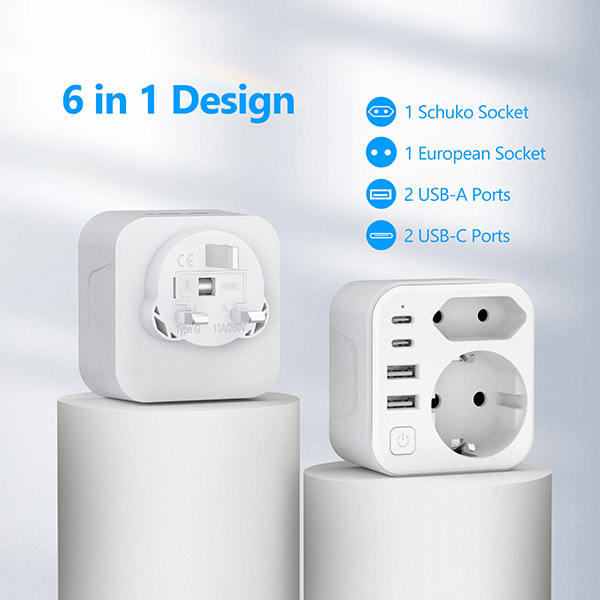 Features: Travel with ease with Type C/E/F inputs and Type G output, ideal for countries like the UK, Ireland, Malaysia and Singapore. Equipped with 1 Schuko socket, 1 European socket, 2 USB-A ports and 2 USB-C ports, enjoy fast, convenient charging for various devices. The two USB-C ports can deliver 5V/3A of charging power, while the two USB-A ports can deliver up to 5V/2.4A of charging power. To ensure long-term use and durability, this travel adapter is constructed of rugged flame-retardant casing with a streamlined design. Safety covers keep unused outlets closed while not being used, protecting your children and pets from each unused outlet. A terrific solution for travel if you need extra power plugs and a USB charger, ensuring you stay connected. Provides enough power outlets to handle multiple devices at once, whether in hotel room, airport terminal, or coffee shop Please note that the switch only provides control of USB ports, NOT AC outlets. |