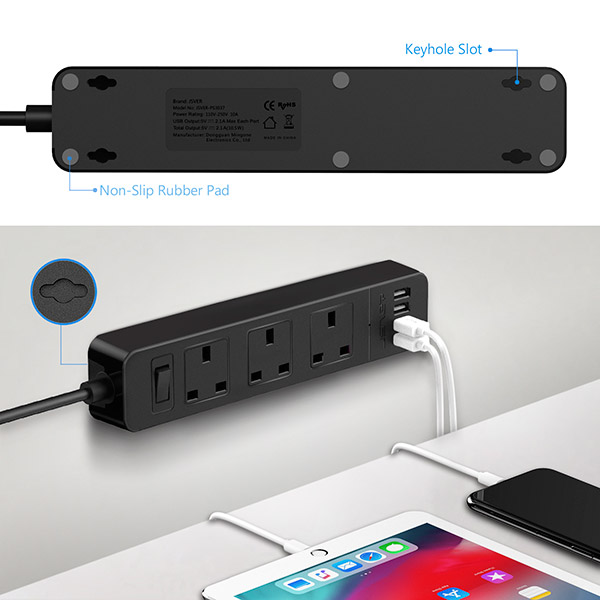 Specifications: Operating voltage/current: 250V~13A Power rating: 3250W max USB output: 10.5W (5V 2.1A) Dimension: 245*51*32mm Material: ABS (750° fire retardant plastics) LED indicator: Red Model: JSVER-PS3037-BK3 |