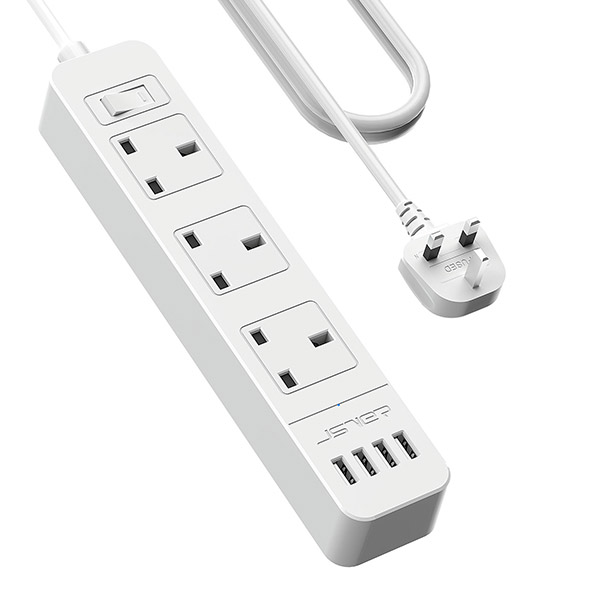 JSVER Extension Lead USB, Power Socket with 3 Outlet 4 USB Charging Station Power Strip 3250W 13A with 3M Power Lead for home and office-White